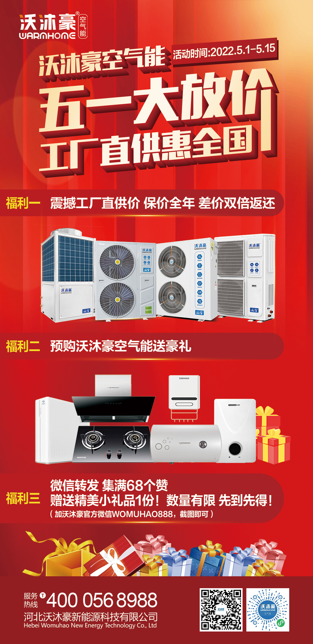 沃沐豪空氣能廠家五一“大放價”直供惠全國!!活動時間:2022年5月1日至5月15日
